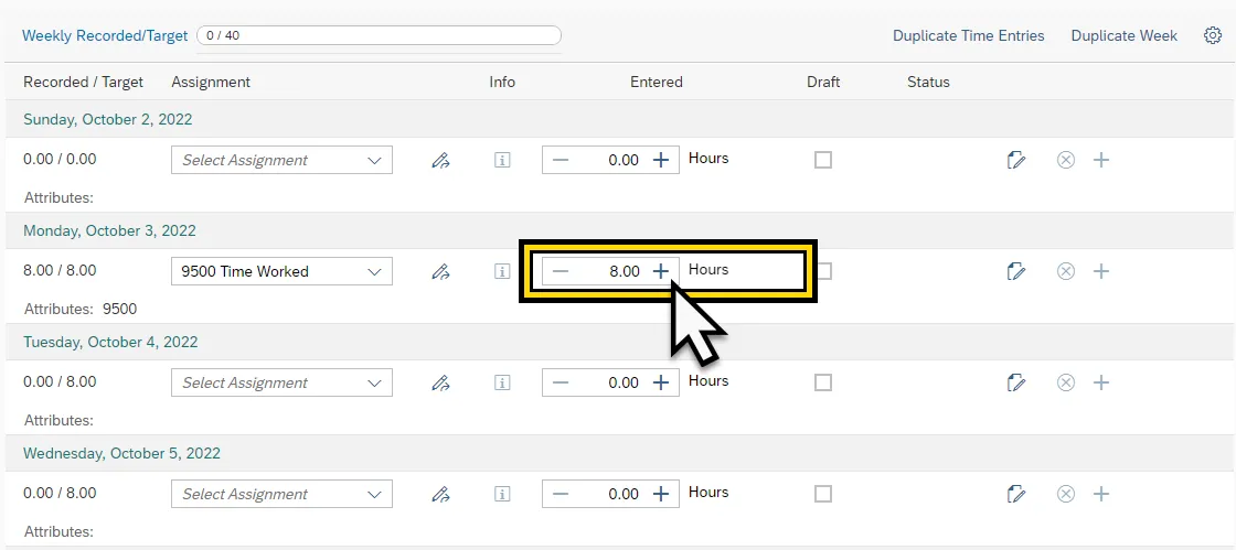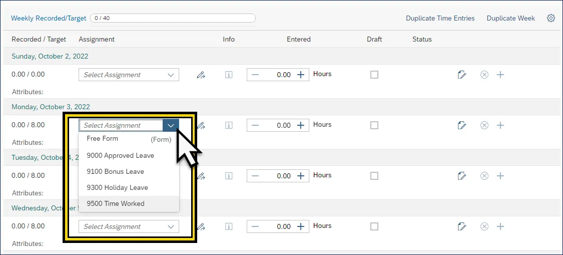 Step 11.    To enter time, navigate to the applicable day.  Click the Select Assignment field dropdown menu to select the Att./Absence type used for that day.
