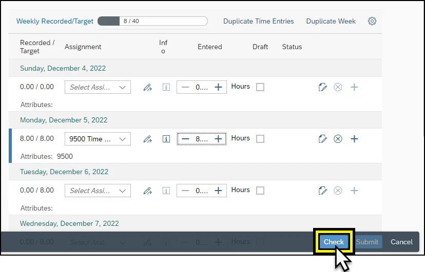 Step 13.    Click Check to ensure all time entries were entered correctly.  If all entries are entered correctly a message will appear stating “No errors were found”.