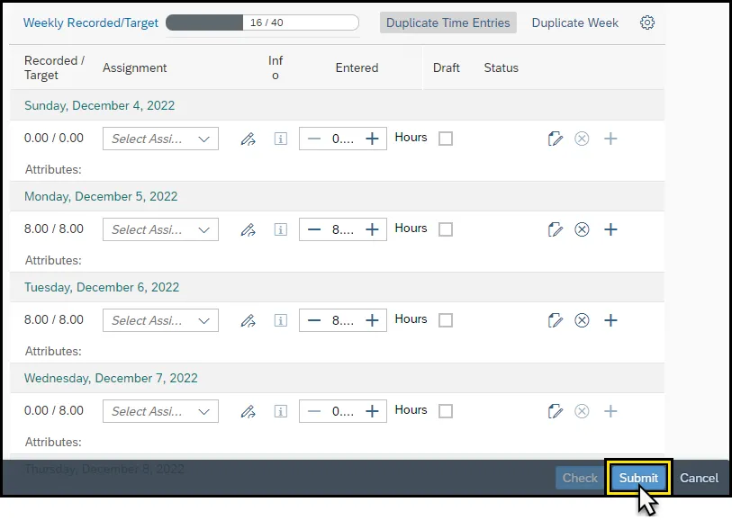 Step 14.    Click Submit once all applicable time entry has been completed.