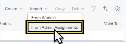 Step 3.    From the Import drop-down menu, select From Admin Assignments.  This will generate the Import Admin Assignments list.