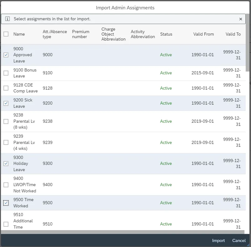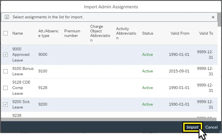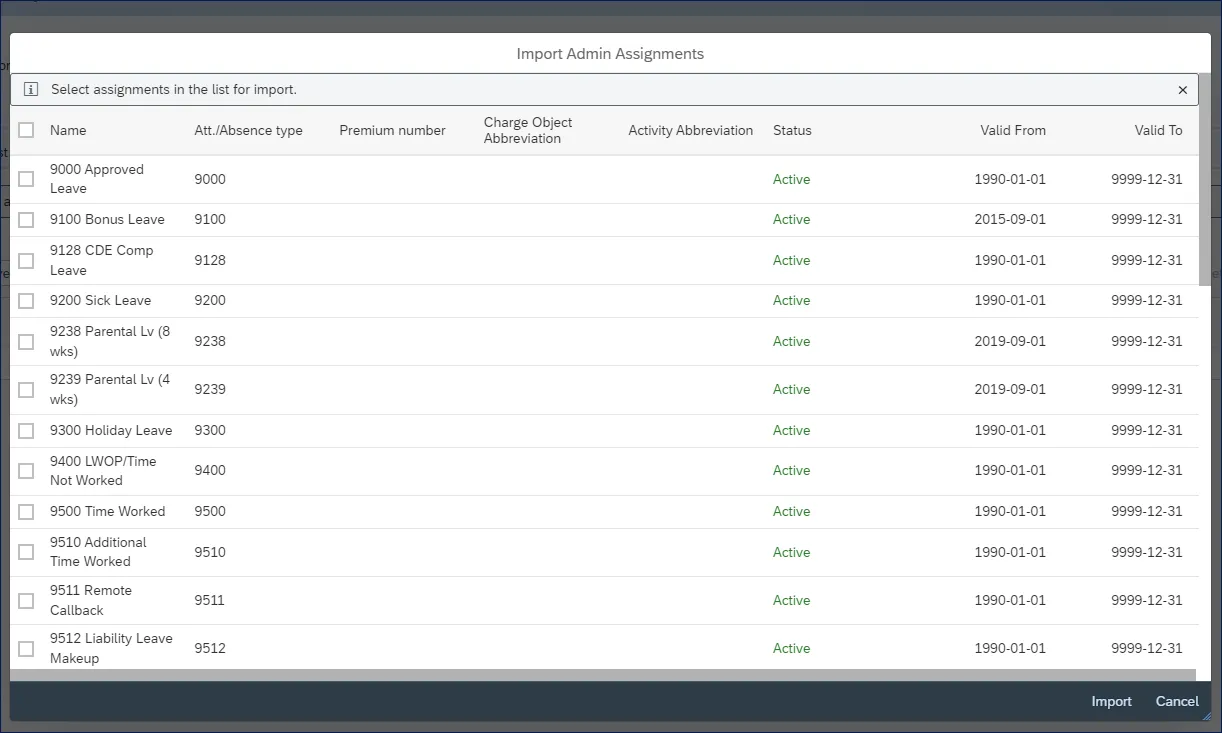 Step 4.    All available attendance and absence types are listed and can be selected for import.  The list follows numerical order and starts from 9000. The scroll bar on the right side of the Import Admin Assignment menu can be used to locate additional types from the list.