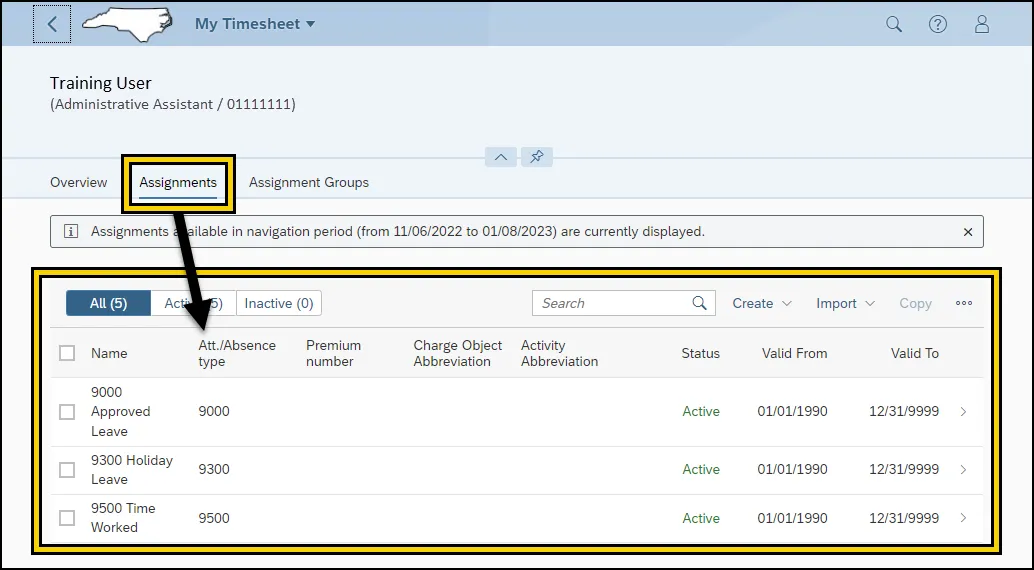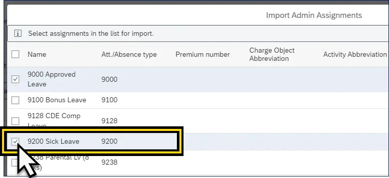 Step 7.    The selected Att./Absence Types will display as Assignments. This successfully imports the Att./Absence Types for view and selection within the Select Assignment Field on the Overview Action Tab.