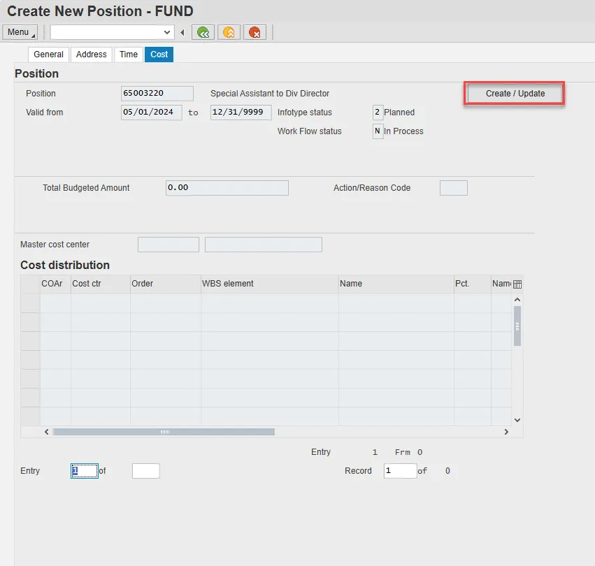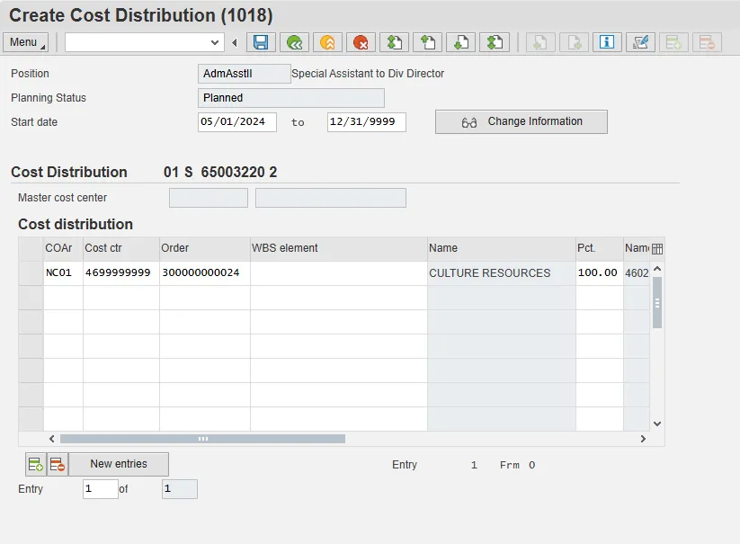The purpose of this Business Process Procedure is to explain how to create the Cost Distribution tab (Infotype 1018) while approving a Create New Position action in the Integrated HR-Payroll System.
