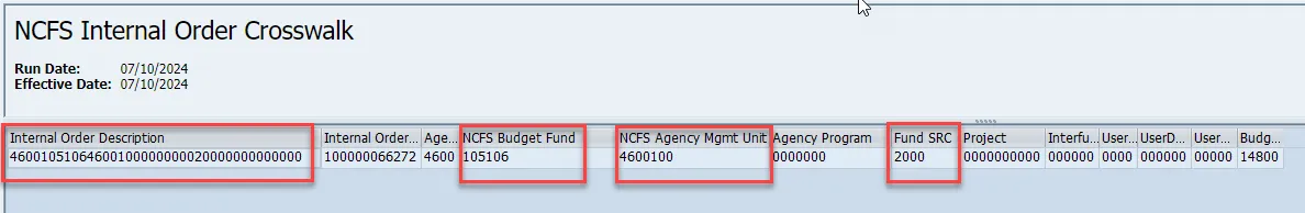- Fund (the SAP fund ends in 01 for appropriated, 04 for federal, 05 for receipts) and the appropriate SAP funding source should be chosen to coincide with the NCFS funding source on the internal order 1000 for appropriated, 3000 for federal, or 2000 for receipts. (Two-digit Agency + NCFS Budget Fund+(01, 04, or 05) 4610510605