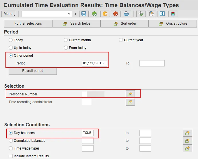 Step 4. Under Selection Conditions, select Day Balances and enter TSLR (Special Leave Remaining Balance).