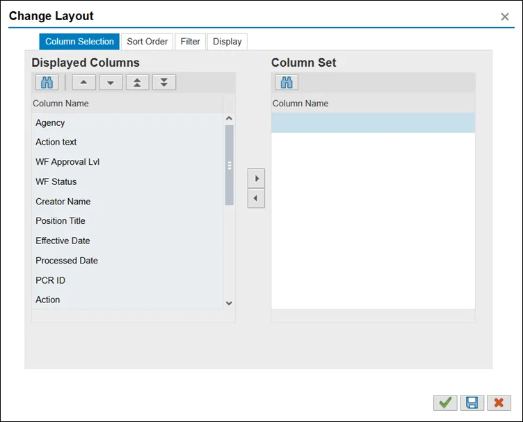 Displayed Columns – Shows the sets of data that will be displayed in the report. Once the green check is clicked, the table displays its columns from left to right in the same order, with the top item in the list appearing as the leftmost column.