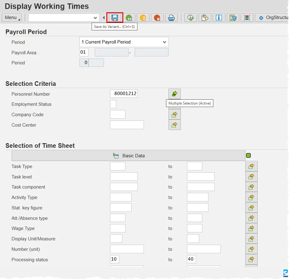 This document will use an example of monitoring of multiple employees’ time entries. By using a variant, you will only have to enter their personnel numbers one time. In subsequent runs of this report, you can enter all the personnel numbers with a few simple clicks. This concept can be applied to most other reports that can be run in the Integrated HR-Payroll System.
