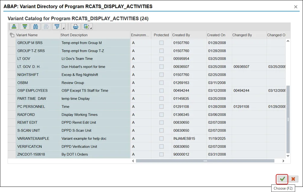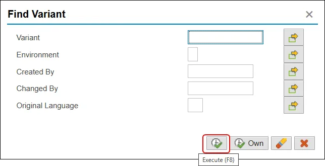 A Find Variant pop-up will appear. Input data to filter the variants that you can choose from. For example, if you enter your personnel number in the Created by field, you will be given a list of variants that you have created. It is not a requirement to enter any data in this pop-up, which would result in all applicable variants being available to choose from.