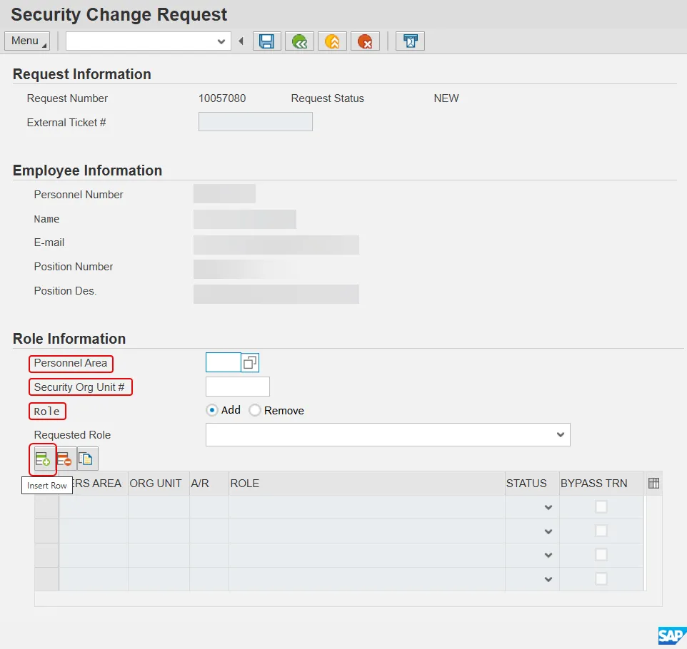 After choosing the Requested Role, press the Insert Row button. Repeat this step for each role to be added or removed.