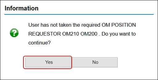 | Training Class OM210 is required | E | If OM Position Requestor role is chosen, and the PERNR has not taken the required classes, error is displayed. | Required OM Position Requestor class OM210 has not been taken. |