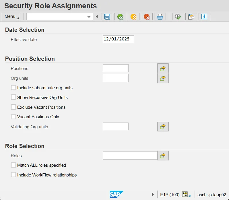 The purpose of this job aid is to explain how to review the security roles and Workflow relationships related to Positions in the Integrated HR-Payroll System by using the zsecrole transaction.