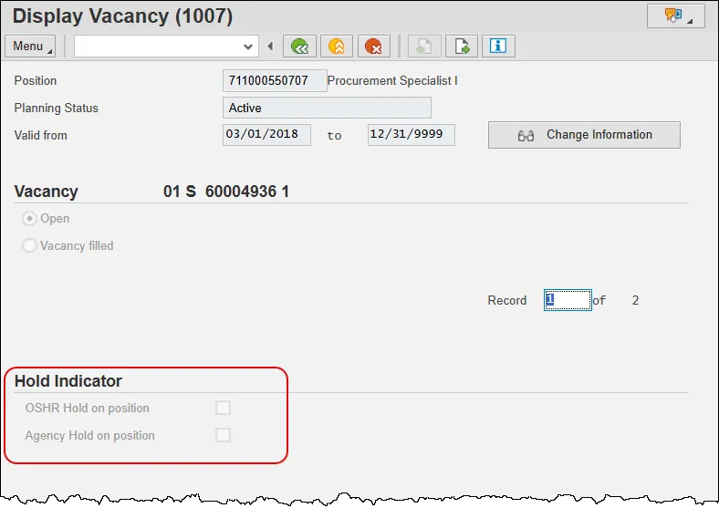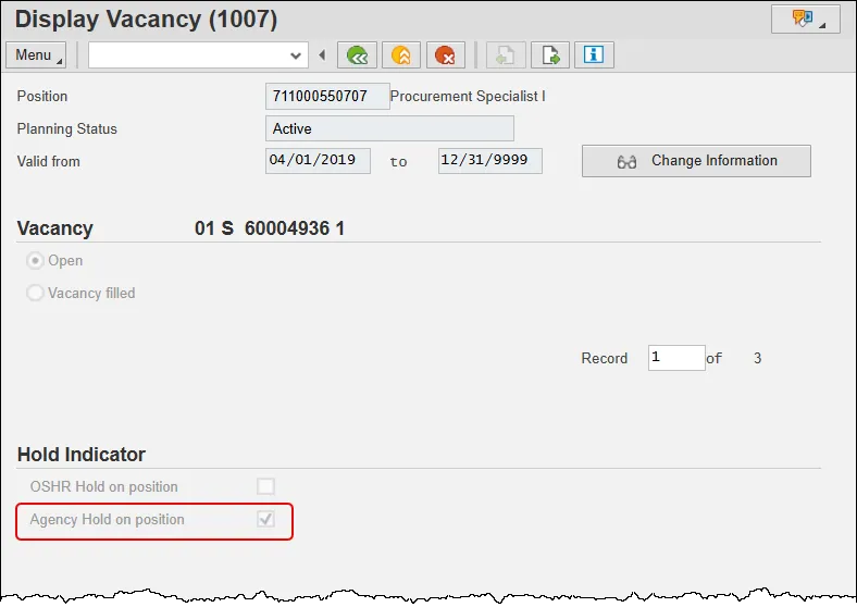 The purpose of this job aid is to explain two hold indicators that have been added to IT1007 (Display Vacancy) in PO13 and PO13D—OSHR Hold on position and Agency Hold on Position.
