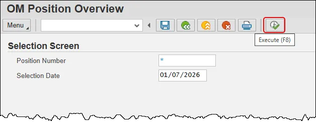 The Position Overview screen will display as of the selection date entered on the first screen. The Run Date is the current date. The other fields are pulled from existing infotypes.