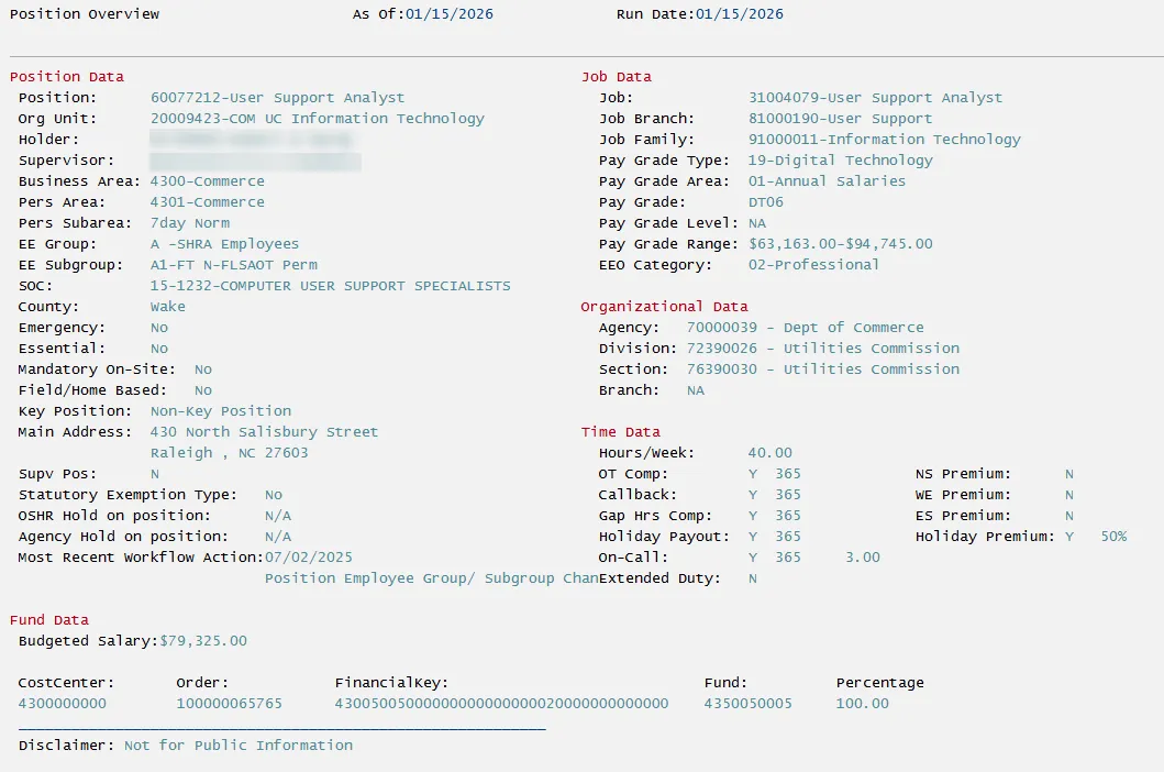 The Position Data section contains general information about the position including, but not limited to, its 8-digit identifier number, working title, holder information and main address.