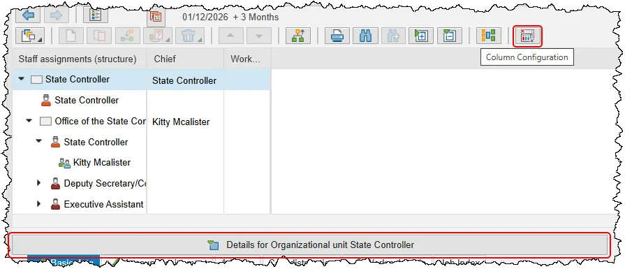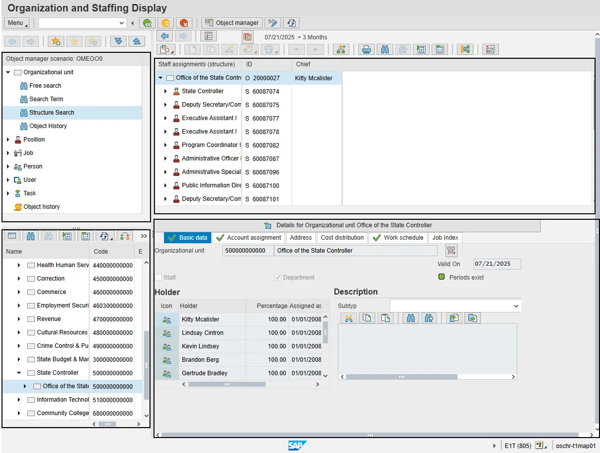 The Organization and Staffing Display transaction (PPOSE) can be used to view the existing organizational structure. It can display the State’s organizational structure and all the elements included in the structure, including org units, positions, jobs, and people. Also, you can use this transaction to find a position number, which is required to complete personnel actions such as new hire.