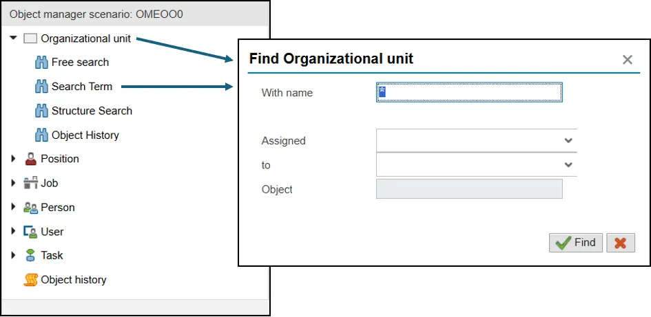 NOTE: Clicking on the object name, such as Org Unit or Position, instead of clicking the node first is the same as using the Search Term option.