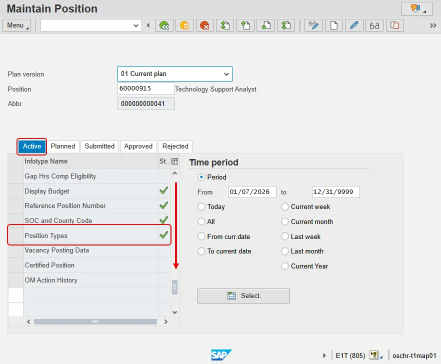 In the screenshot below, there is already an IT9023 Position Types record on the selected position – indicated in the screenshot by the green check to the right of the infotype selected.