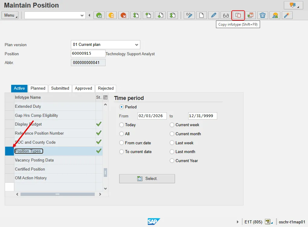 Step 4. Select the box to the left of ‘Position Types to select the infotype, then click the Copy button.
