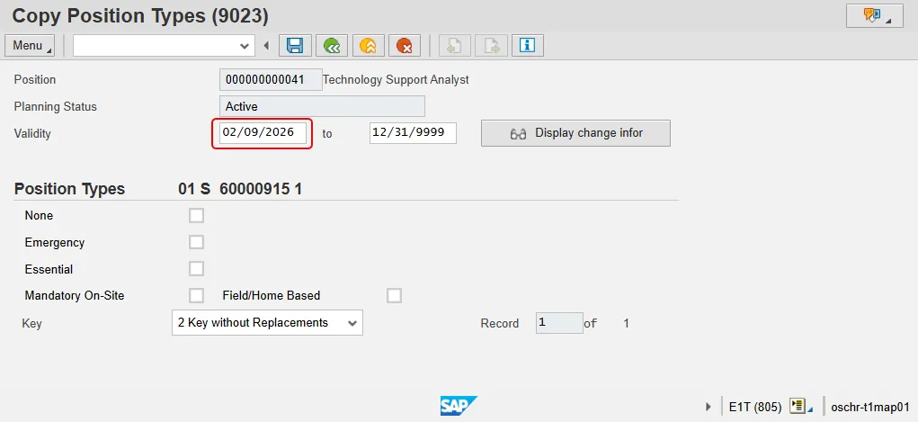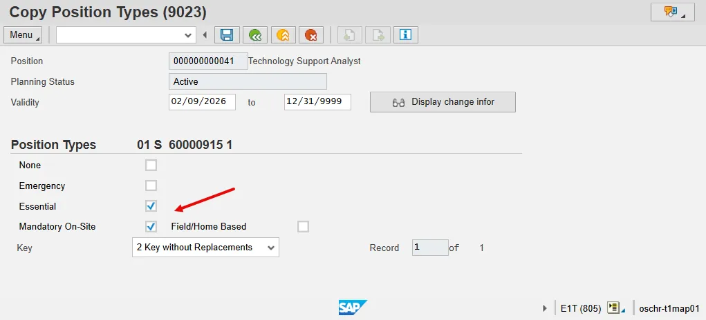 Note: When making a change to this infotype’s information, all relevant subtypes must be selected again. For example, if a position was previously Essential and will now be Essential and Mandatory On-Site, when copying the record, the user will choose the effective date and then select both the Essential and Mandatory On-Site designations.