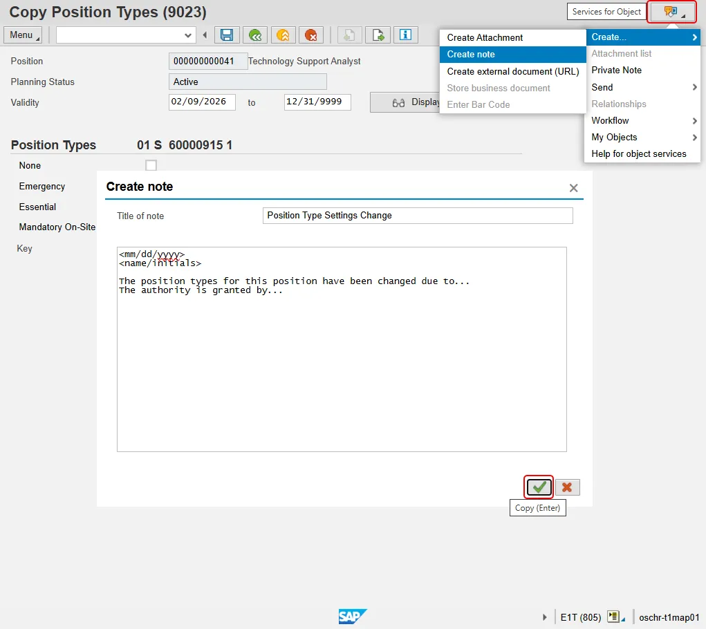 Step 8. Optional Step: Though not required, BEST Shared Services recommends creating a note when making changes to a position’s Position Types settings. Click the Services for Objects button, hover over Create and then click Create note.