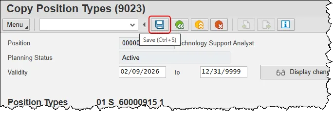 Note: The user has the option to create, copy, or change an Infotype 9023 – Position Types record.
