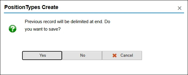 Step 10. If copying an existing Position Types record, a confirmation box will pop-up asking the user to confirm that the system should delimit the prior record the day before this new record is created; click Yes to have the system delimit the prior record: