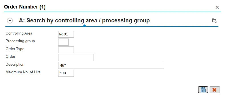 - Enter the NCFS full company center in the Description field to search for the appropriate Order number. Using 46* as shown in the screen shot below will search for NCFS company 4601 (DNCR) and all matches for fund 1000.
