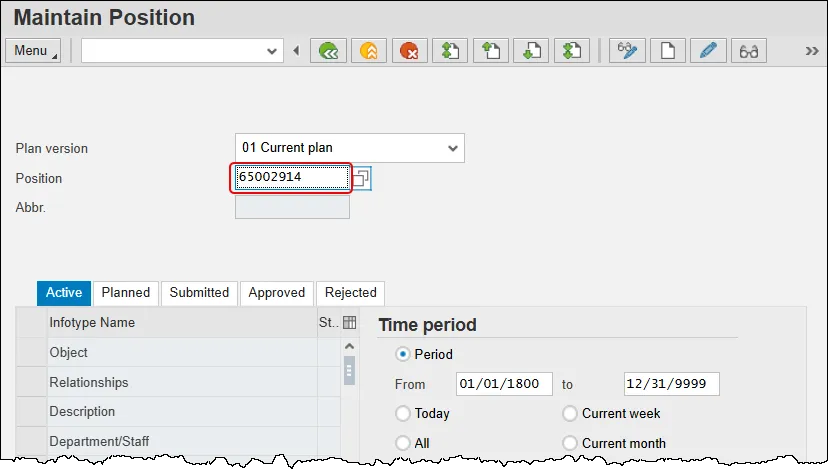 Step 2. Input the position number that needs updating. This document will use 65002914 from the Development Environment. Access client 899 to follow along in a “live” system.