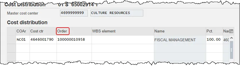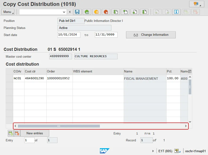 Step 6. Review each of the current Cost Distribution fields for the position by utilizing the scroll bar at the bottom of the row(s) of data.