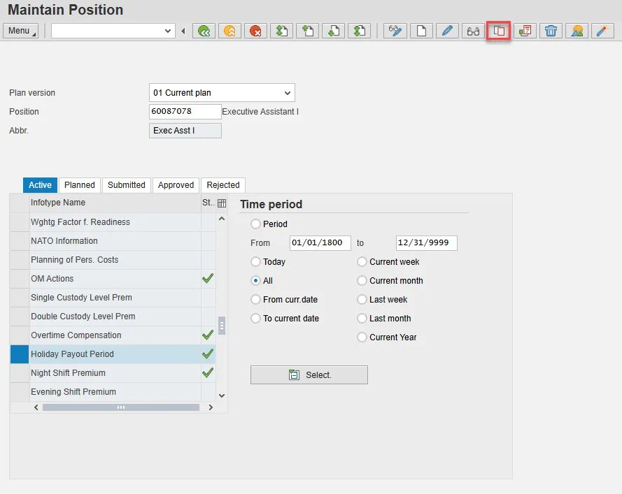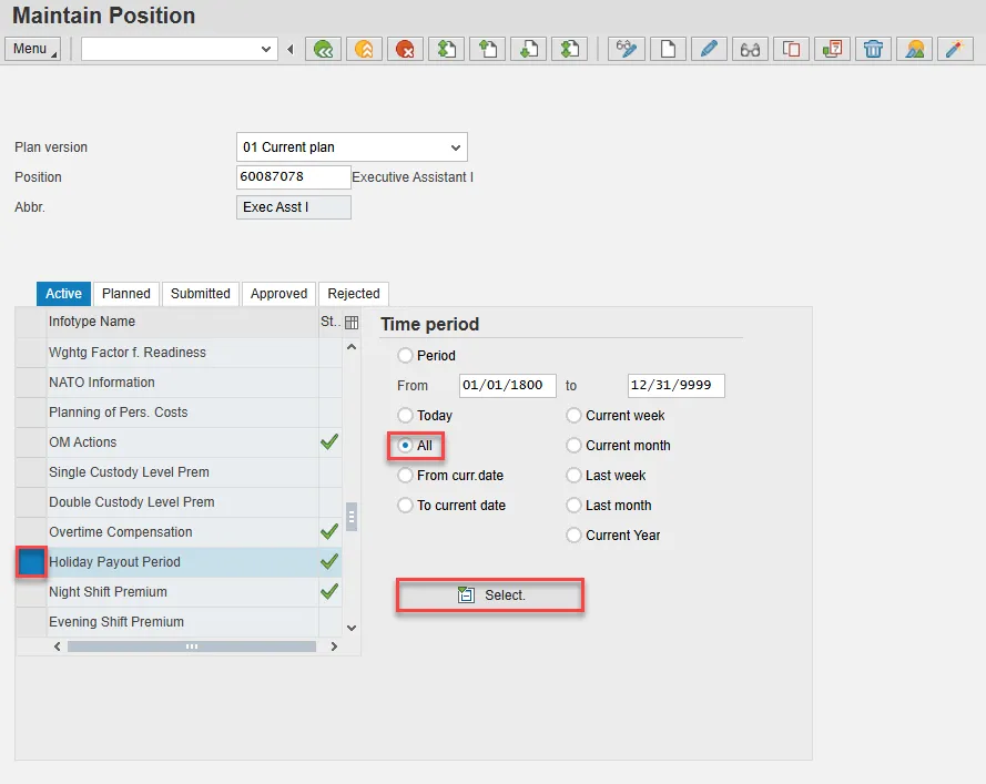 • Scroll down the list of position infotypes and click the square in front of the Holiday Payout Period row. There may or may not be a green check already present.