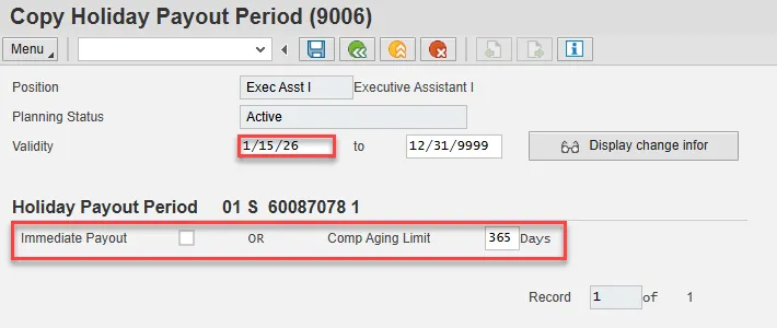 A list of all Holiday Payout Period Infotypes for the Position will be displayed, including the Validity Dates and either an indicator for immediate payout or a number representing the Comp Aging Limit in days.