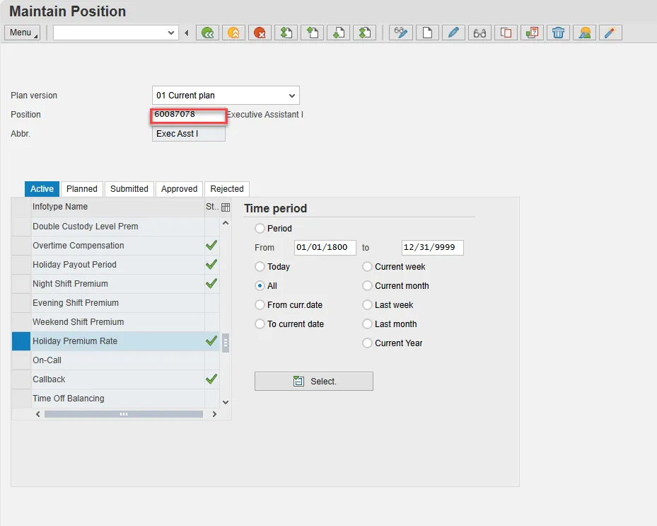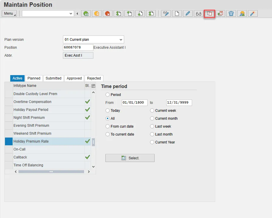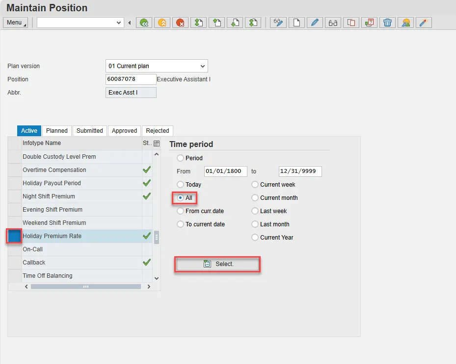 - Scroll down the list of position infotypes and click the square in front of the Holiday Premium Rate row. There may or may not be a green check already present.