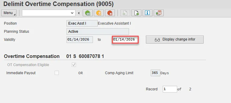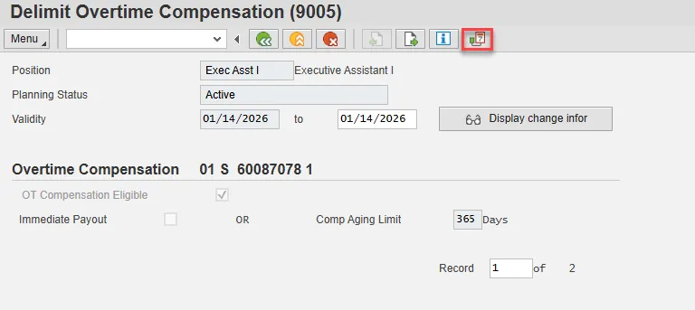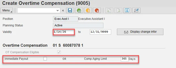 A list of all Overtime Compensation infotypes for the Position will be displayed, including the Validity Dates, eligibility for the compensation and if so, whether it will be paid immediately or the comp aging limit in days.