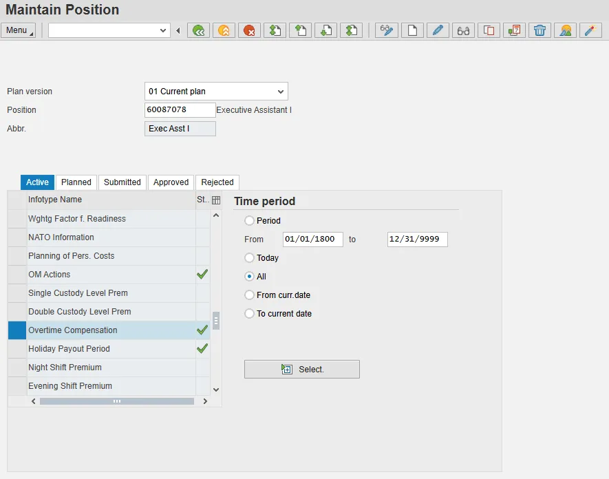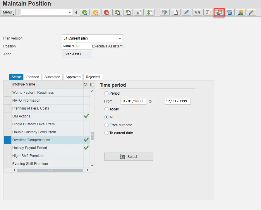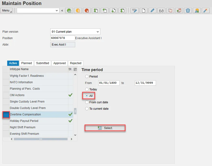 - Scroll down the list of position infotypes and click the square in front of the Overtime Compensation row. There may or may not be a green check already present.