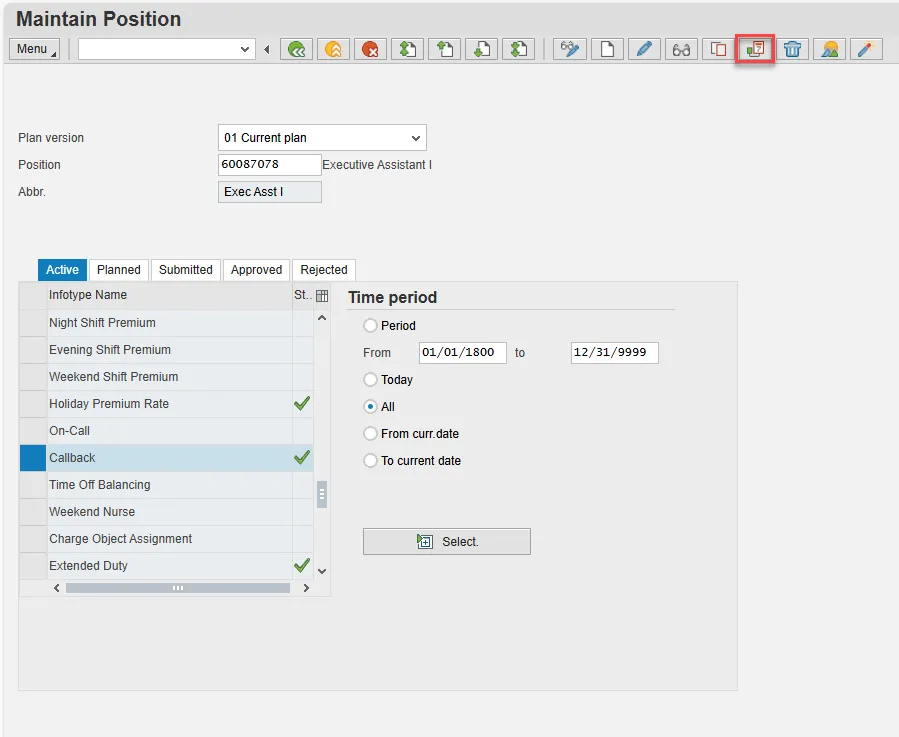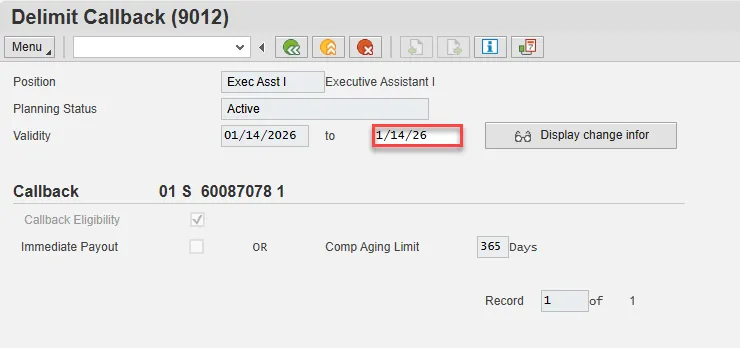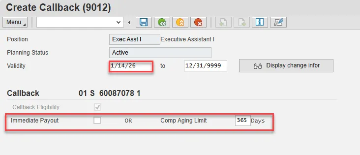 A list of all Callback infotypes for the Position will be displayed, including the Validity Dates, eligibility for the compensation and if so, whether it will be paid immediately or the comp aging limit in days.