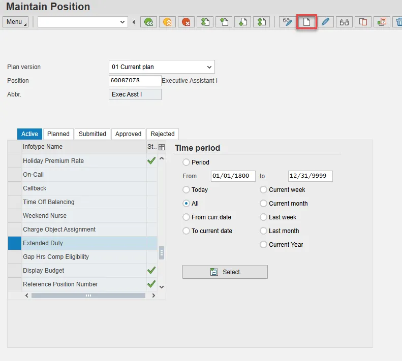 • Scroll down the list of position infotypes and click the square in front of the Extended Duty row. There may or may not be a green check already present.