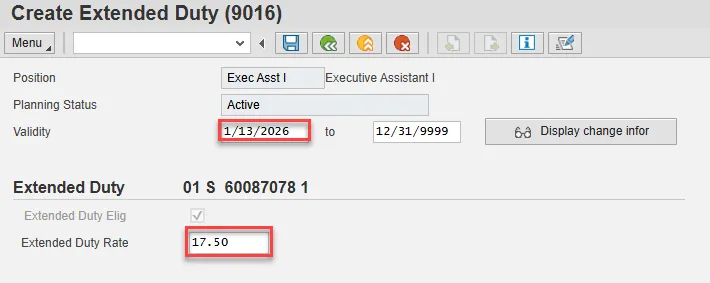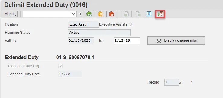 A list of all Extended Duty Infotypes for the Position will be displayed, including the Validity Dates, eligibility, and the extended duty rate.