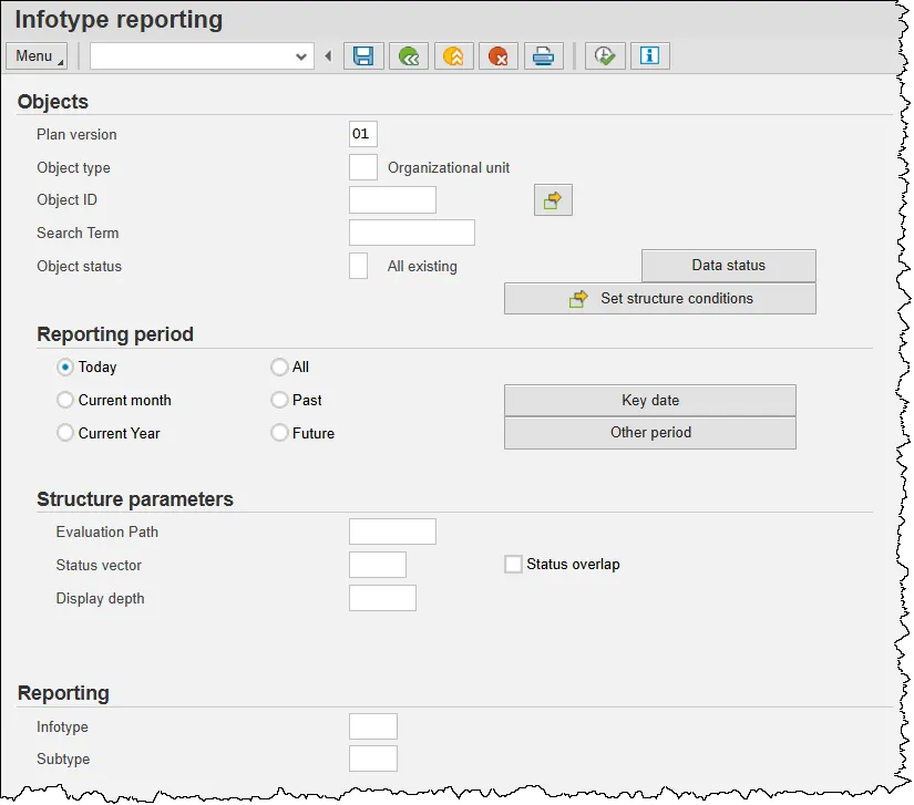 - Infotype – Data can be input to filter results to one specific infotype within the object being reported upon.