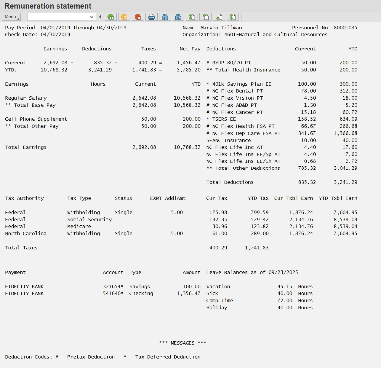 Sick Leave – The number of hours entered for sick leave taken (code A/A 9200). The dollar amount under Current is the number of sick leave hours taken times the hourly rate (as explained above in Vacation Leave).