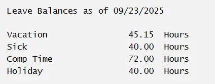 Note: The Leave Balances in the various Leave Types as of the day the statement was printed. Be aware that even if a statement is printed for a prior period, the balances will still reflect the balances as of the date the statement was printed and not the balance as of the pay period.