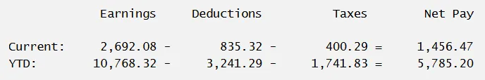 Taxes – Federal, state, local taxes for this pay period. The amount may vary from month to month based on earnings.