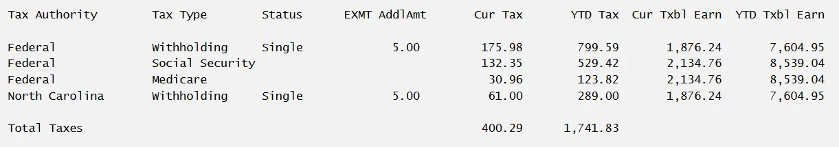Total taxes equal taxes paid based on the employee’s taxable earnings for current pay period. Year-to-date totals are also shown. The amounts may vary each pay period depending upon earnings. Claimed exemptions for Federal and State taxes are shown, as well as any additional tax monies that the employee may have elected to have withheld from each paycheck (AddlAmt).