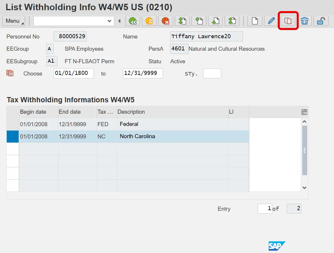 To record the state tax exemption, highlight the current NC withholding record and click Copy.