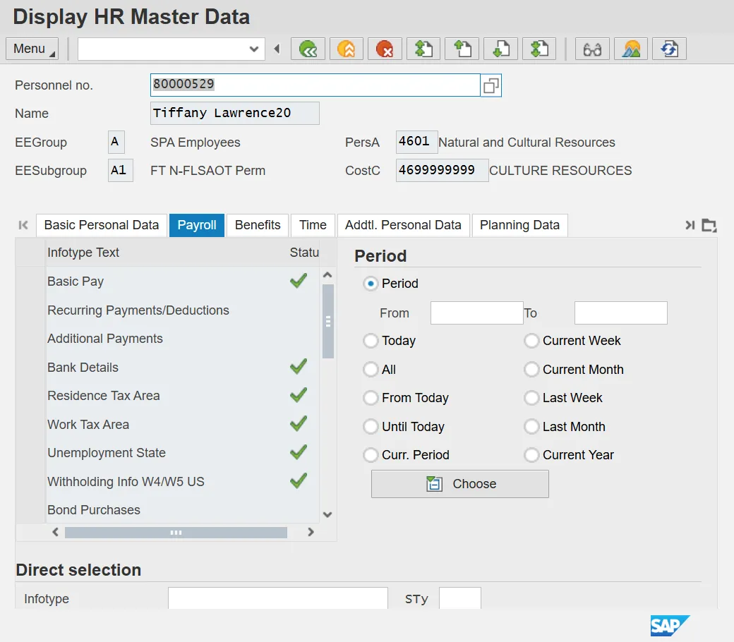 Information: Select the appropriate Infotype to display. Infotype records can be accessed through the various /Tabs/ or through the /Direct Selection/section of the screen. Infotypes listed within the Tabs with a corresponding green checkmark indicate that he infotype records is populated with data. Infotypes without a green checkmark may not be populated at this time.