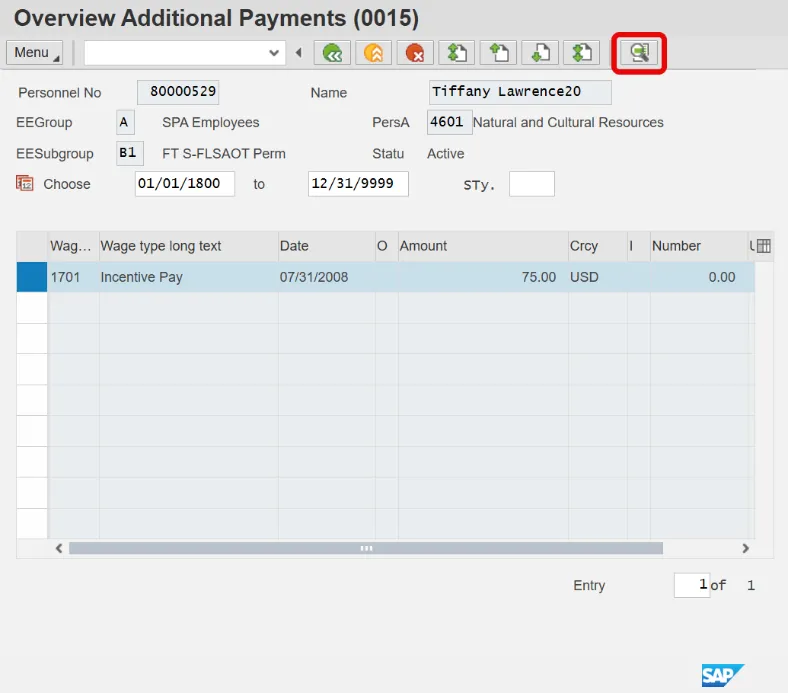 Information: Review the Additional Payments data as appropriate. There may be multiple records for infotype 0015, available by clicking on the next record. If there are multiple records on the screen, additional data is available by selecting those records.