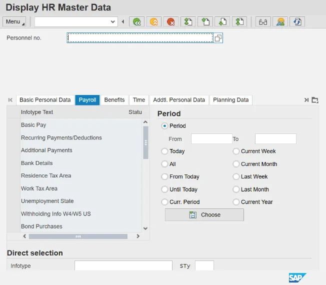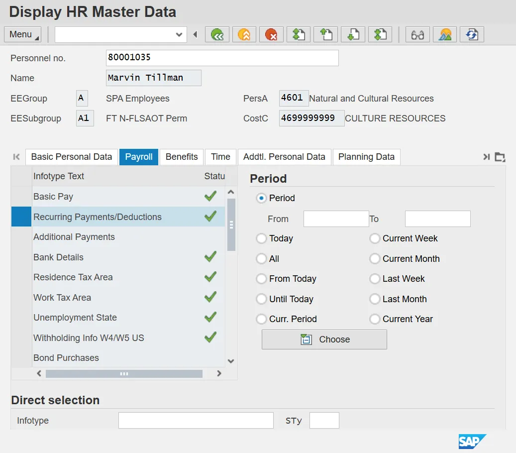 Select the appropriate Infotype to display.  Infotype records can be accessed through the various Tabs or through the Direct Selection section of the screen.  Infotypes listed within the Tabs with a corresponding green checkmark indicate that the infotype record is populated with data.  Infotypes without a green checkmark may not be populated at this time.