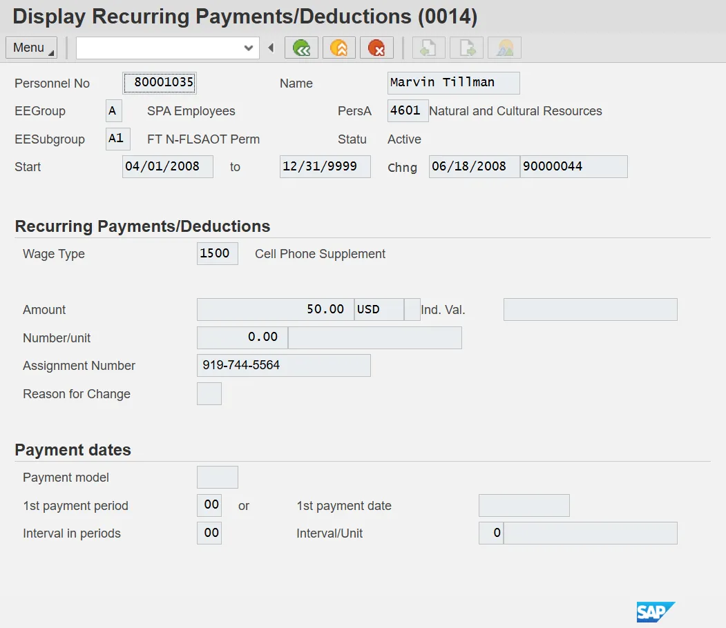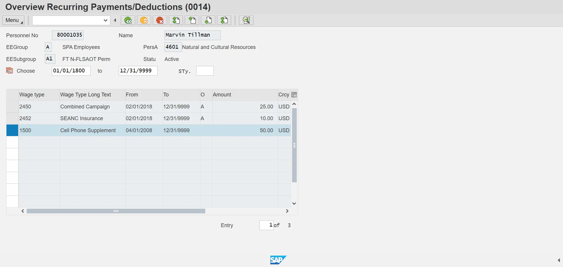 Review the Recurring Payments/Deductions infotype data as appropriate.  There may be multiple records for IT0014 available by clicking on the next record.  If there are multiple records listed on the screen, additional data is available on other tabs.