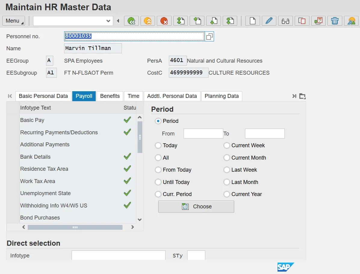 Information: Select the appropriate Infotype to display. Infotype records can be accessed through the various /Tabs/ or through the /Direct Selection/ section of the screen. Infotypes listed within the Tabs with a corresponding green checkmark indicate that the infotype record is populated with data. Infotypes without a green checkmark may not be populated at this time.