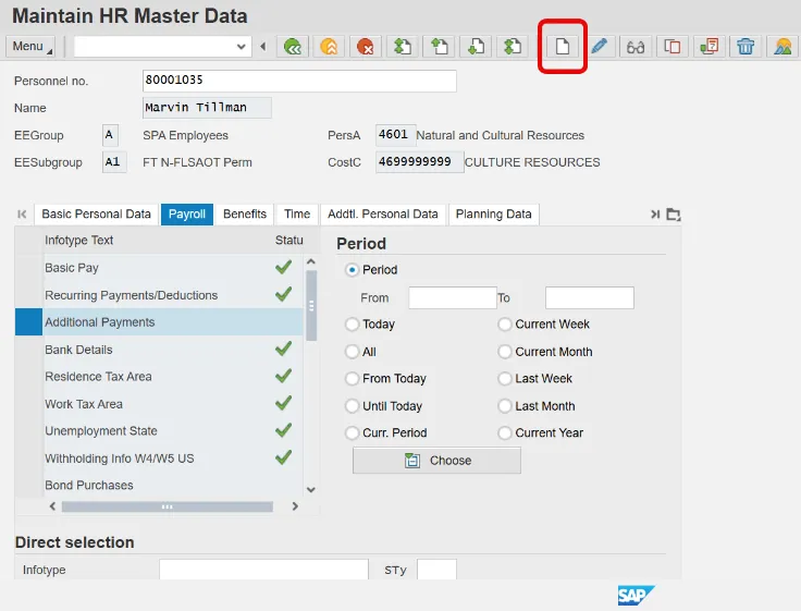 Information: Select the appropriate Infotype to display. Infotype records can be accessed through the various /Tabs/ or through the /Direct Selection/ section of the screen. Infotypes listed within the Tabs with a corresponding green checkmark indicate that the infotype record is populated with data. Infotypes without a green checkmark may not be populated at this time.