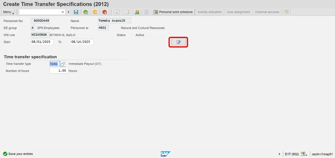 Step 4. Enter 2012 (Time Transfer Specifications) in the Infotype field.